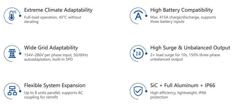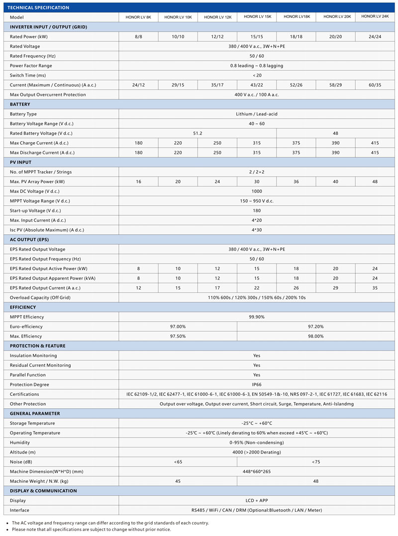 The HONOR LV series is a leading three-phase lowvoltage hybrid inverter designed forresidential and small commercial applications,supporting 8~24kW systems. It features up to 415A charge/discharge current and three battery inputs forversatile energy storage solutions. Built with advanced SiC technologyand a robust full aluminum IP66-ratedenclosure, itdelivers high efficiency, reliability, anddurability. The inverter supports a wide voltage inputrange (154-286V per phase), automatic 50/60Hz frequency adaptation, strong surge resistance, and150%unbalanced three-phase output.