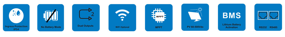 – WIFI remote monitoring optional- Support multiple output priority: SUB,SBU,SUF- EQ function to optimize battery performance and extend lifecycle