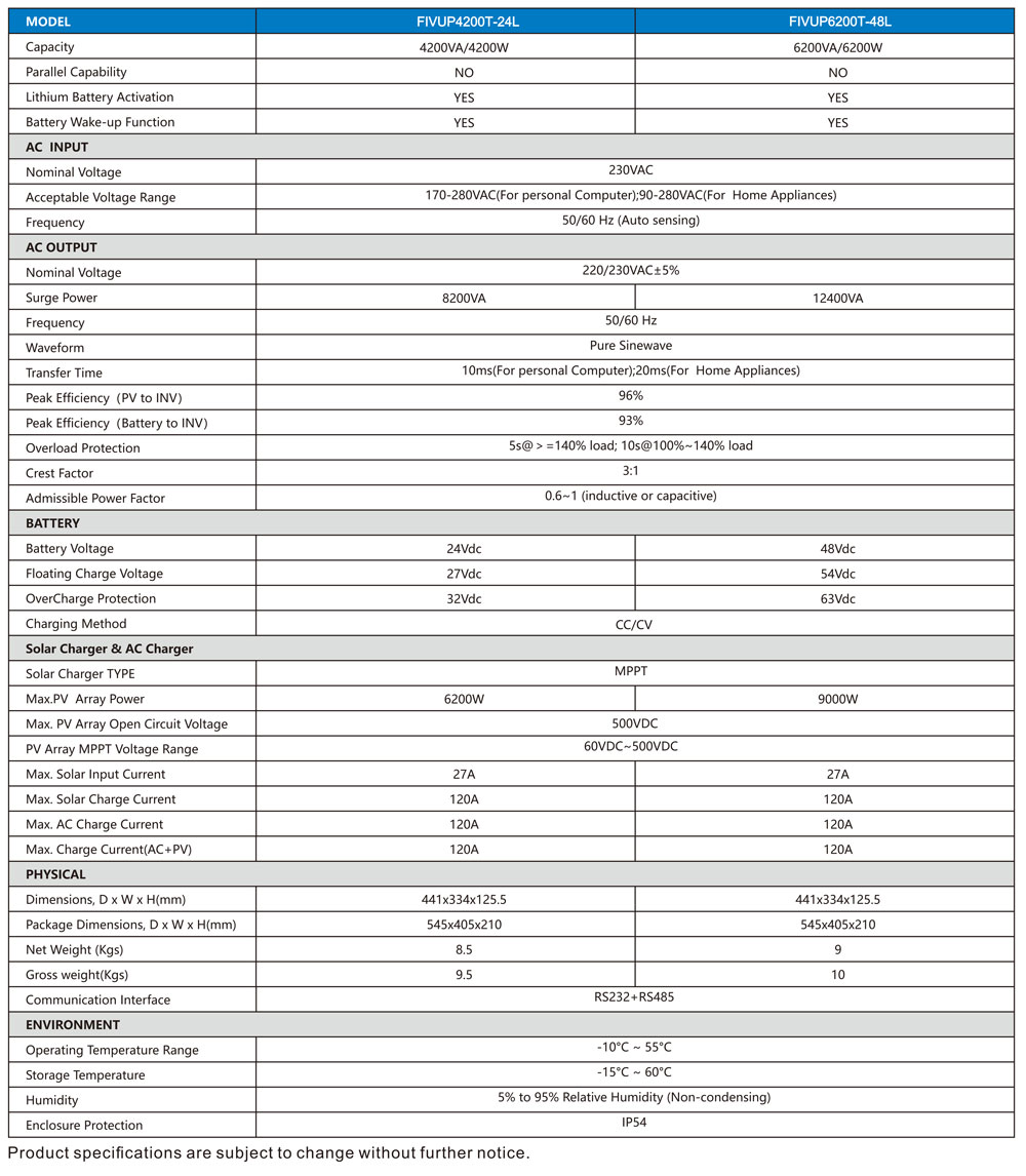 – Lithium battery activation function by PV or Utility- Compatible work with LiFePO4 battery via RS485